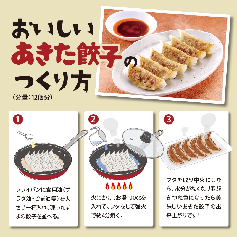 | 特徴 | 秋田を代表する食材『比内地鶏』と『いぶりがっこ』がたくさん入った、ジューシーでもっちりな秋田満彩のあきた餃子です! |
