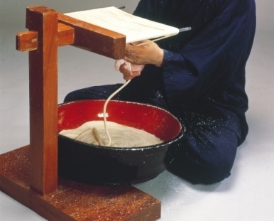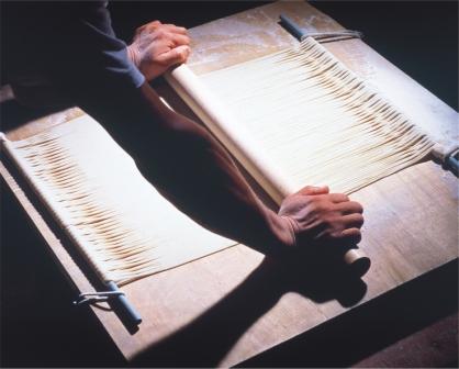 【練り】【手綯い】 稲庭うどん 伝統の手綯(てない)製法。 縄を綯うようにあやがけしていきます。 -